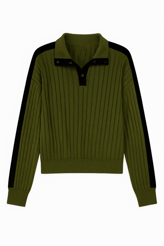 Eleganter Jogginganzug aus geripptem Strick in Olivgrün mit schwarzen Akzenten – stilvoll, bequem und vielseitig kombinierbar.
